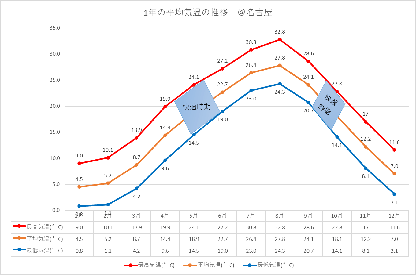冷房も暖房もつけなくてもいい温度 最高気温25度以下、最低気温15度以上の期間は春と秋で2か月もないほどです。有効に使いたいですね。