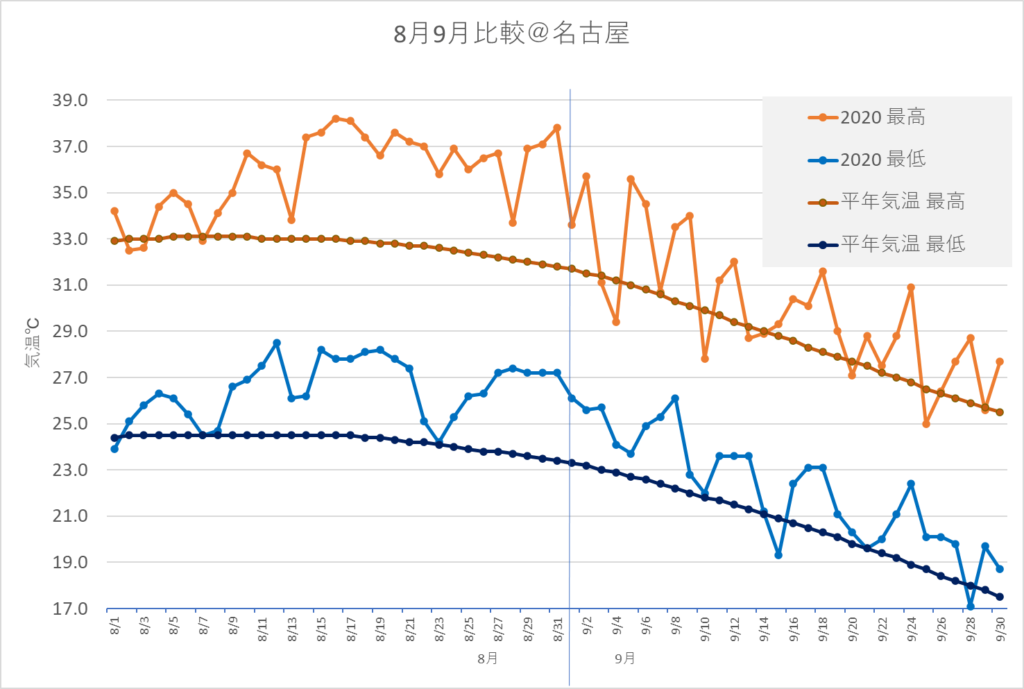 今年の8月は平年気温を大きく上回りました。最低気温も平年を大きく上回り寝苦しい日が続きました。9月は徐々に最高気温が平均と交わることも多くなりましたが、最低気温では平均を下回ったのは2日ほどしかありません。