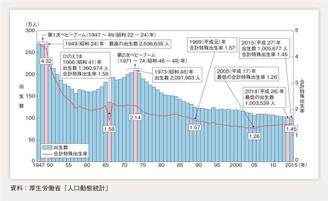 時の情勢により、経済が活発に動いている時期、とくに高度経済成長期などは顕著で、子どもをたくさん産む時代、第二次ベビーブームが起き(1971-1974年)、その当時は200万人以上いました。