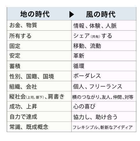 占星術のKeikoさんの書かれている記事の表で、地の時代から風の時代に変わるキーワードが対比で書かれています。
