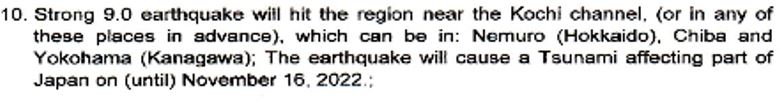 2022年11月16日に(もしくはその日までに)この地震は津波を伴い、日本の一部の地域に影響を及ぼすだろう。