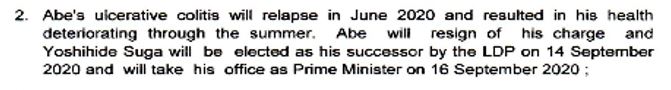 それにより安倍氏は総理を辞任し、2020年9月14日、次の総理はYoshihide Sugaが選挙で選ばれ、9月16日から総理の職に就くだろう。