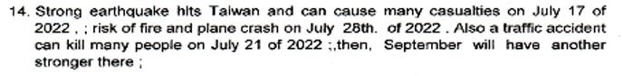 2022年7月17日、巨大地震が台湾を襲い、多くの死傷者がでるだろう。