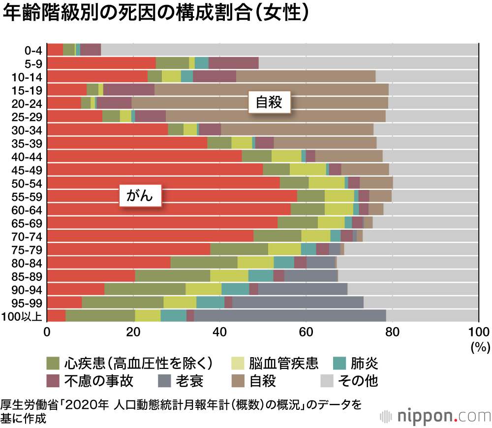10代から30代にかけては自殺の割合が大きく、40代以降になるとガンが増えてきます。