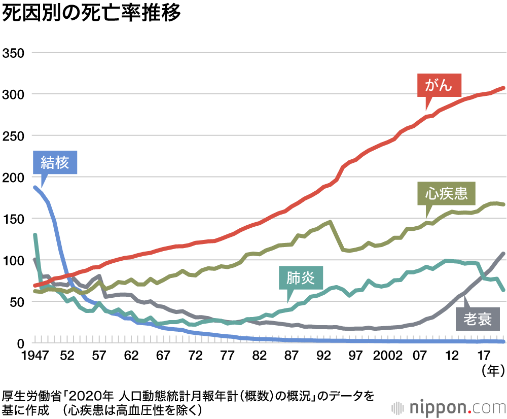 ガンが1位とは知っていましたが意外にも老衰が増えているのですね。2005年以降は老衰の割合が上がっているそうです。