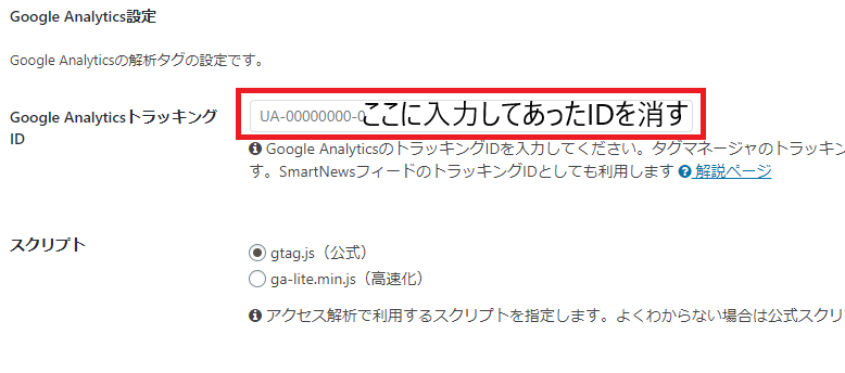 そこにもGoogle Analitics設定でトラッキングIDを入れる箇所があります。