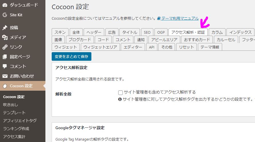 Cocoonの設定の中にアクセス解析・認証というタブがあります。