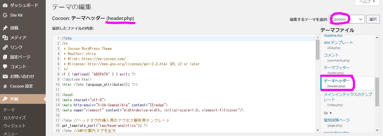 外観のタブ>テーマディター>Cocoon子テーマからCocoonに変更>テーマヘッダーheader.phpを選びます。