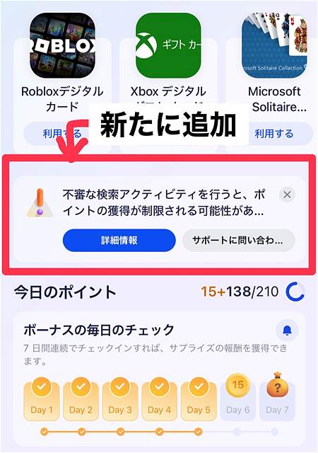 「新たに追加された不審なアクティビティを行うと、ポイントの獲得が制限される可能性があります」