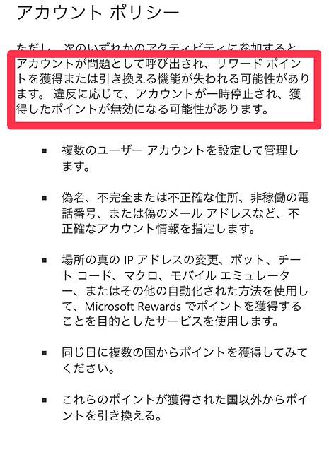 違反するとアカウントの停止やポイント無効などの注意事項が羅列されています。