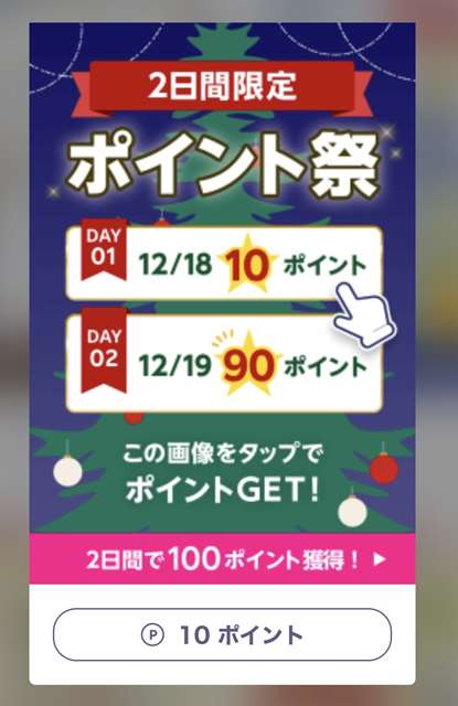 一日1ポイントもらえていましたが12/24で終了となります。ワンタップでもらえてたのでそれが消えるのは惜しいところです。アプリを開いて➔次のページへ行ってスクロールして下まで行き、タップして獲得、となると30秒程度はかかります。
