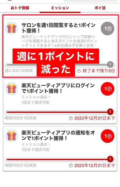 今まで週に2ポイントもらえていたのが1ポイントに減額。