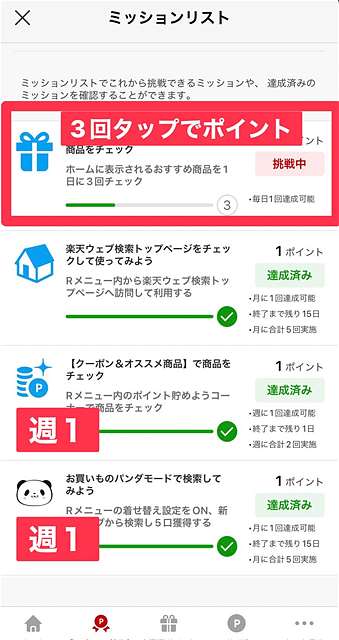 ポイントミッションを3回タップすることによって1日1ポイントもらえます。