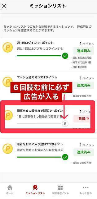 記事を6回読んで1ポイントもらえますが、そのたびに広告が入るのですぐやめました。