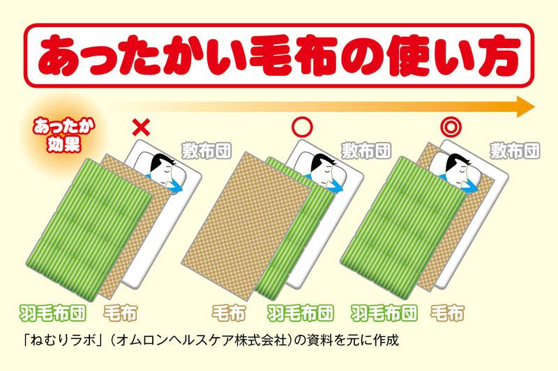 私も左側の図のように敷布団の上に寝て、その上に毛布、そして掛布団をかけていますが